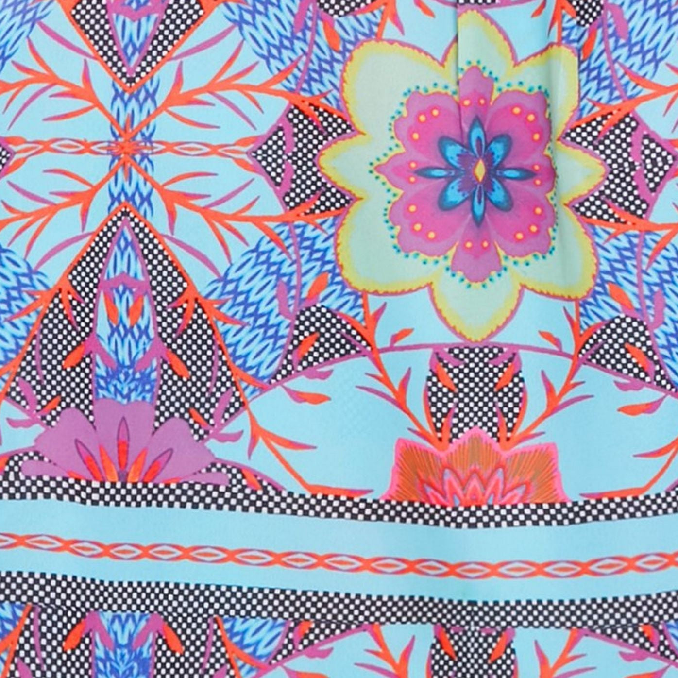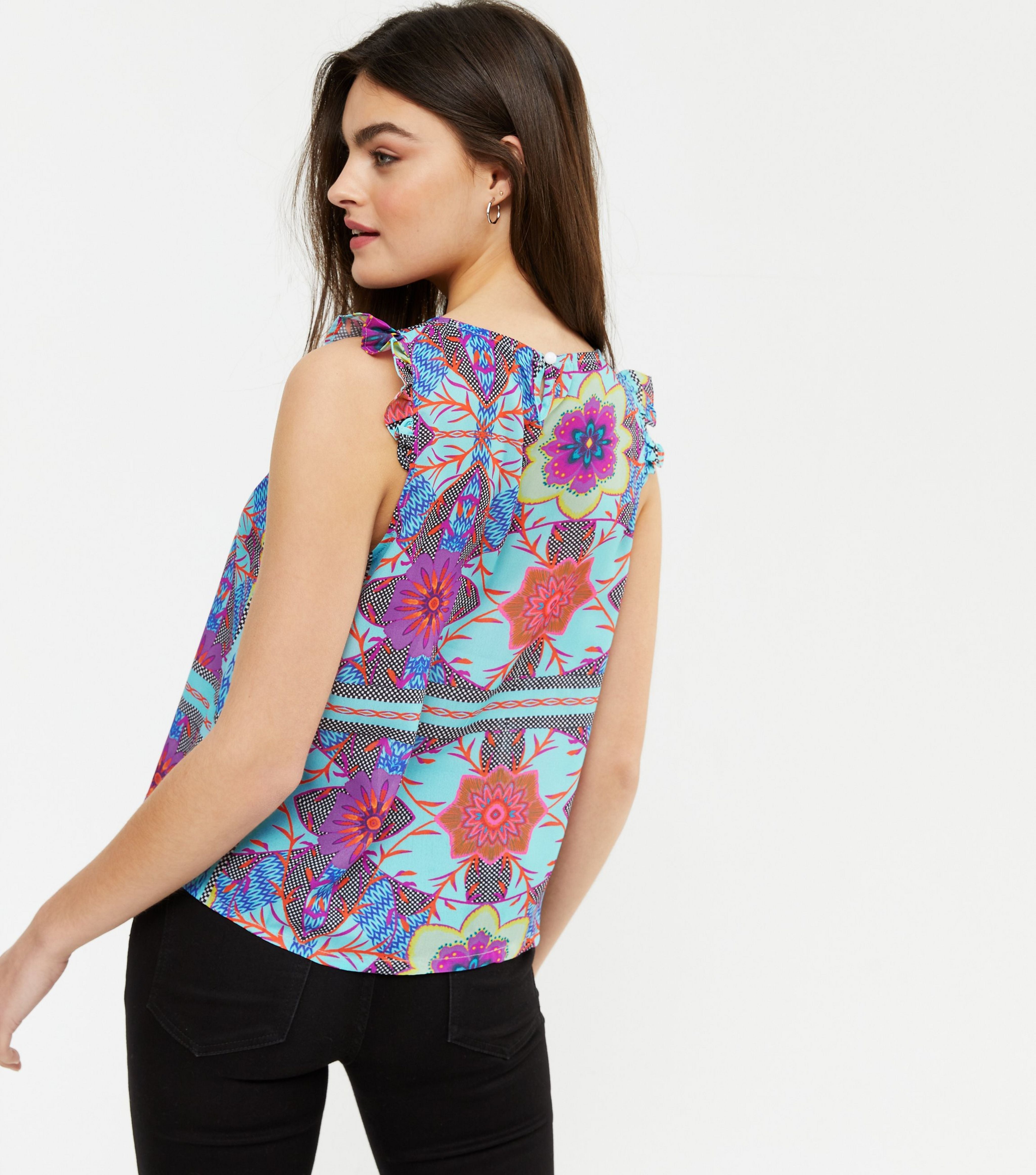 Brighten up your wardrobe with this vibrant sleeveless top, featuring a bold floral print in shades of pink, purple, and aqua blue. Designed with playful frill detailing at the shoulders and a flattering round neckline, this top brings a fun and feminine touch to any outfit. Perfect for pairing with jeans or a skirt for a stylish daytime look.