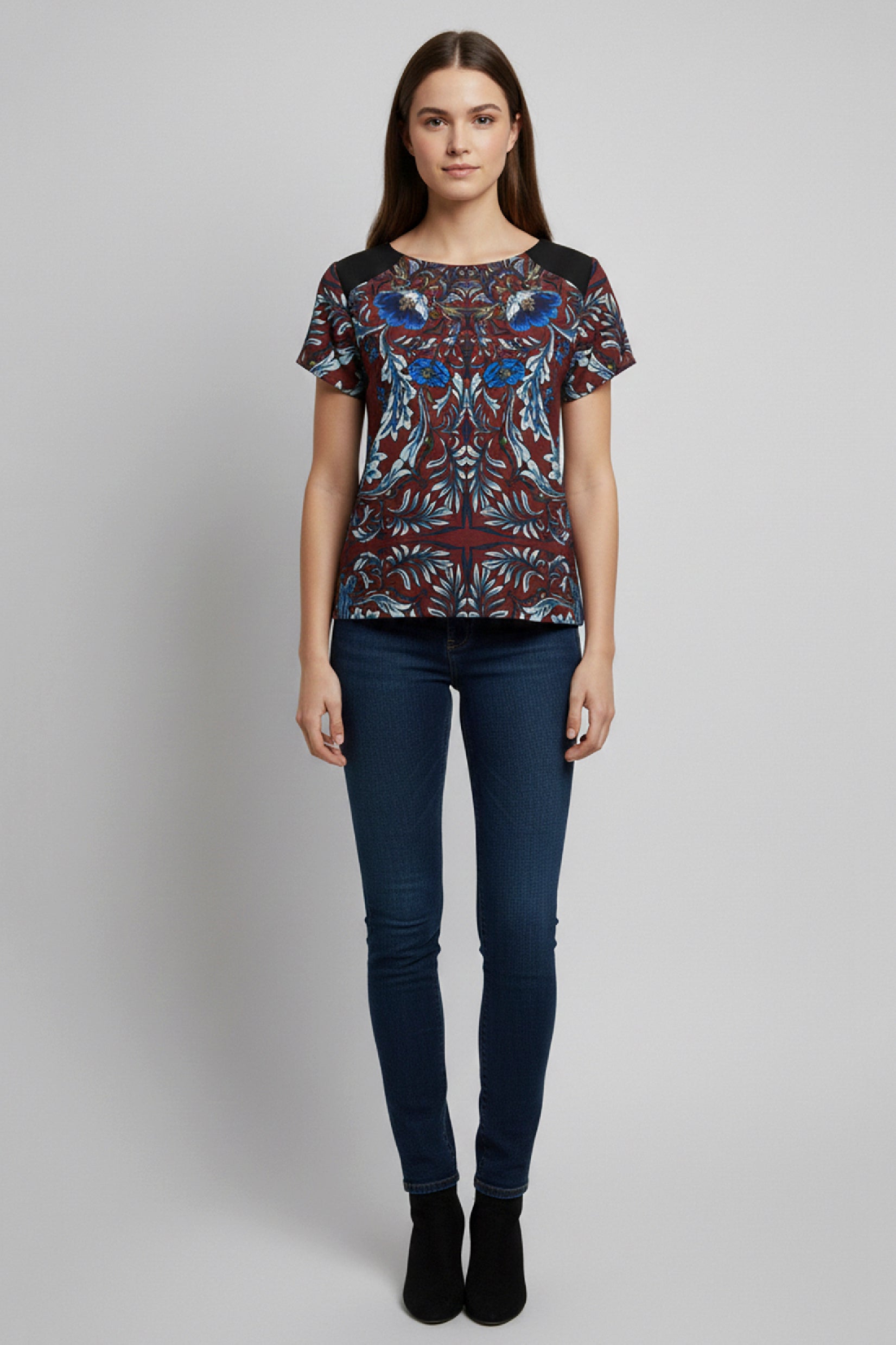Elevate your everyday style with this floral print short sleeve top, designed with a flattering round neckline and contrast shoulder panels for a modern finish. The rich, detailed print adds visual interest, while the soft, comfortable fabric makes it ideal for all-day wear. Easy to style and effortlessly versatile, this top works perfectly with jeans, trousers, or skirts for both casual and smart-casual looks. A polished wardrobe staple that transitions seamlessly from day to evening.